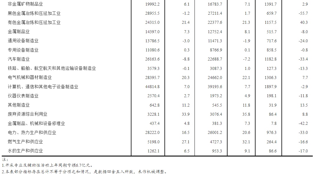 1—4月份,在41个工业大类行业中,19个行业利润总额同比增长,20个行业下降,1个行业由亏转盈,1个行业持平。主要行业利润情况如下:煤炭开采和洗选业利润总额同比增长1.99倍,石油和天然气开采业增长1.38倍,有色金属冶炼和压延加工业增长40.3%,化学原料和化学制品制造业增长14.8%,电气机械和器材制造业增长7.7%,非金属矿物制品业增长2.9%,纺织业增长1.0%,专用设备制造业下降0.8%,计算机、通信和其他电子设备制造业下降2.9%,农副食品加工业下降10.2%,通用设备制造业下降24.0%,石油、煤炭及其他燃料加工业下降29.4%,电力、热力生产和供应业下降33.0%,汽车制造业下降33.4%,黑色金属冶炼和压延加工业下降55.7%。