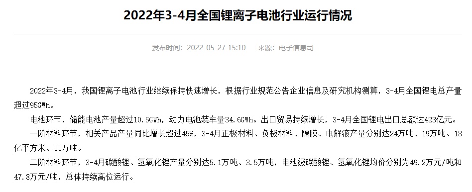 智通财经APP获悉,5月27日,据工信部数据显示,2022年3-4月,我国锂离子电池行业继续保持快速增长,根据行业规范公告企业信息及研究机构测算,3-4月全国锂电总产量超过95GWh。电池环节,储能电池产量超过10.5GWh,动力电池装车量34.6GWh。出口贸易持续增长,3-4月全国锂电出口总额达423亿元。