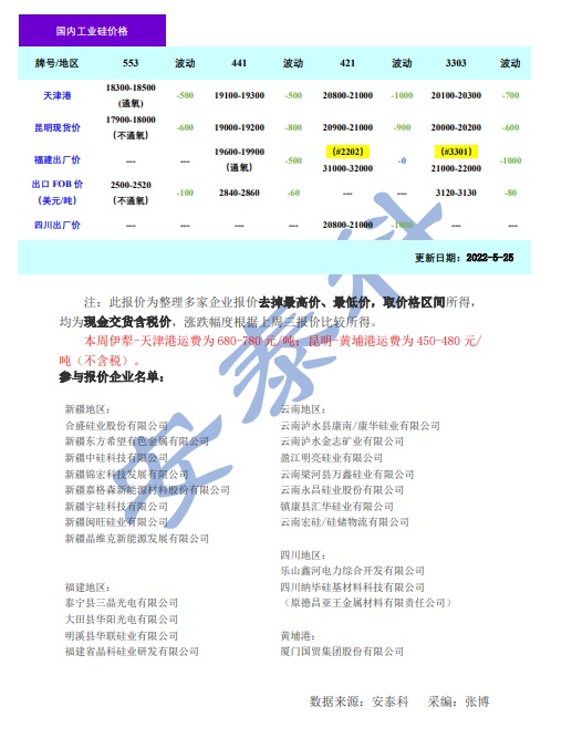 智通财经APP获悉,5月27日,硅业分会发布工业硅周评表示,本周工业硅市场信心偏弱,各牌号硅价承压下行。本周业硅价格延续下跌行情,冶金级价格下跌500-800元/吨,主流价格在17900-19900元/吨,化学级价格下跌900-1000元/吨,主流价格在20800-21000元/吨。同时,本周多晶硅价格不变,与上周持平,单晶致密料主流价格25.87万元/吨;铝合金ADC12价格下跌200元/吨,主流报价20300元/吨;有机硅DMC价格下跌2000元/吨,主流报价24000元/吨。