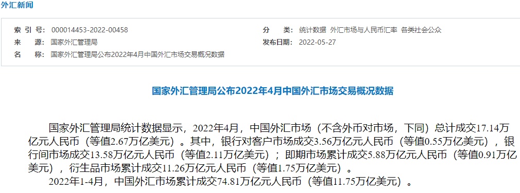智通财经APP获悉,5月27日,据外汇局数据显示,2022年4月,中国外汇市场(不含外币对市场)总计成交17.14万亿元人民币(等值2.67万亿美元)。其中,银行对客户市场成交3.56万亿元人民币(等值0.55万亿美元),银行间市场成交13.58万亿元人民币(等值2.11万亿美元);即期市场累计成交5.88万亿元人民币(等值0.91万亿美元),衍生品市场累计成交11.26万亿元人民币(等值1.75万亿美元)。2022年1-4月,中国外汇市场累计成交74.81万亿元人民币(等值11.75万亿美元)。