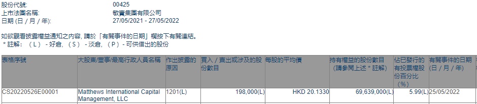 智通财经APP获悉,香港联交所最新资料显示,5月25日,Matthews International Capital Management, LLC减持敏实集团(00425)19.8万股,每股作价20.1330港元,总金额约为398.63万港元。减持后最新持股数目为6963.9万股,最新持股比例为5.99%。