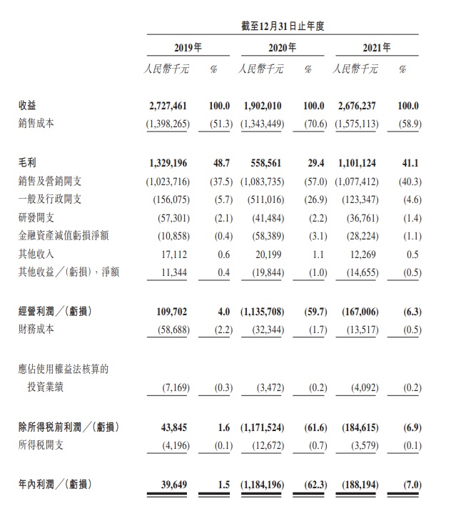 财务方面,2019年、2020年及2021年度,该公司收入分别为27.27亿元(人民币,下同)、19.02亿元、26.76亿元;2019年年内利润为3964.9万元,2020年及2021年年内亏损分别为11.84亿元、1.88亿元。