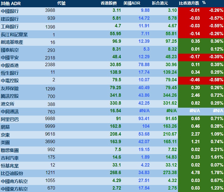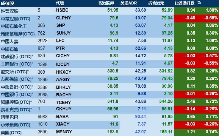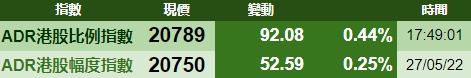 智通财经APP获悉,周五美股三大指数悉数上涨,港股ADR指数上涨,按比例计算,收报20789点,较香港收市82.08涨点或0.44%。