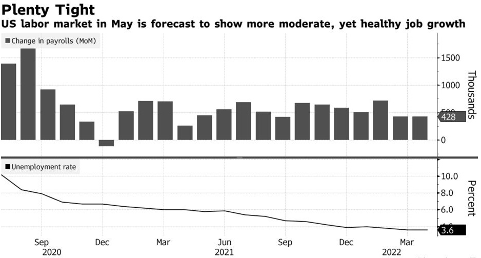 5月失业率预计将降至3.5%的全球最低水平,5月平均时薪预计将环比增长0.4%。美联储的决策者可能会对这一数据泰然以待,因为他们准备继续支持大幅加息,等待就业增长更为持续的降温增长,以帮助缓和工资上涨和通胀飙升。