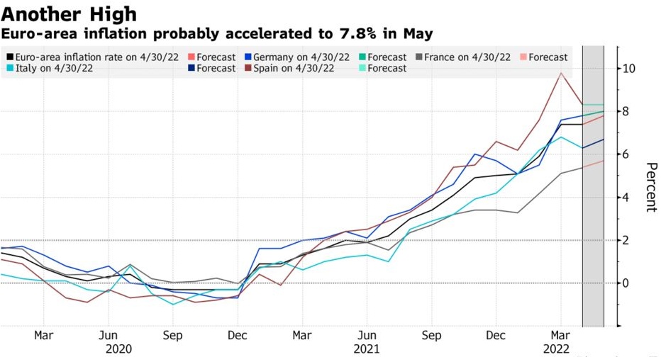 美联储预计将加入激进加息央行的队列;加拿大央行可能再加息50个基点,英国央行也早已加息50个基点。除此之外,大部分央行早已进行加息压通胀,只有少许同行尚未加息,例如,在欧元区通胀再次创下纪录的情况下,欧洲央行最快将于7月开始加息。