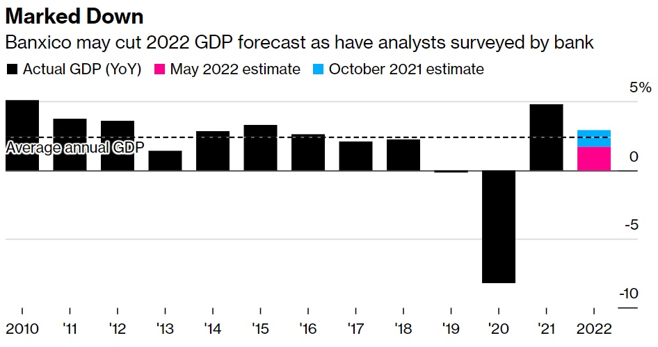 墨西哥央行上周三在其季度通胀报告中更新了一系列预测。在3月份的报告中,墨西哥央行将墨西哥2022年的GDP预期从3.2%下调至2.4%,而且很可能再次下调。