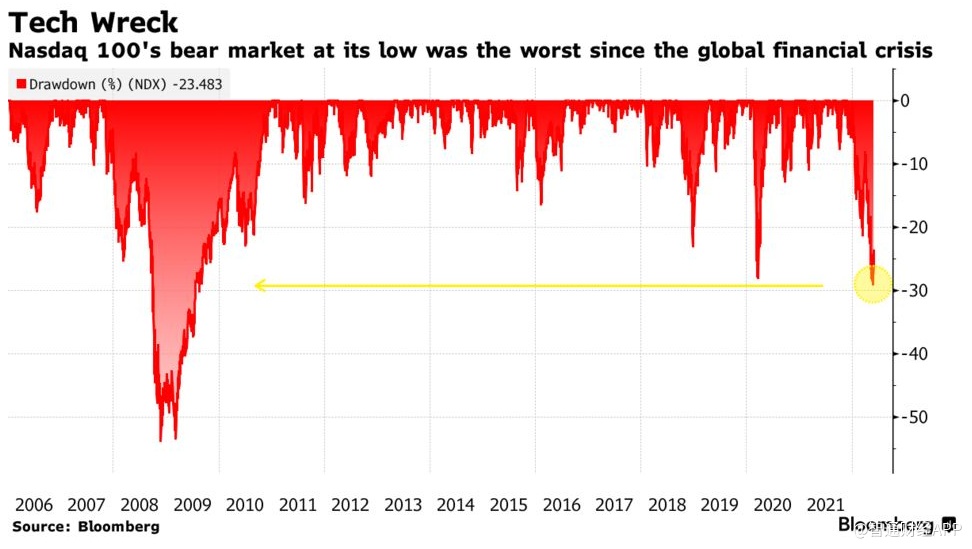 纳斯达克100指数遭遇全球金融危机以来最严重的熊市。尽管科技股的历史性暴跌有所缓和,但纳斯达克100指数仍较去年11月的高点下跌23%。