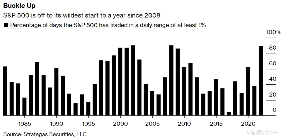 投资者也遭受了2008年以来最严重的打击。Strategas Securities的数据显示,2022年,标普500指数在89%的交易日中的每日波动幅度至少为1%。