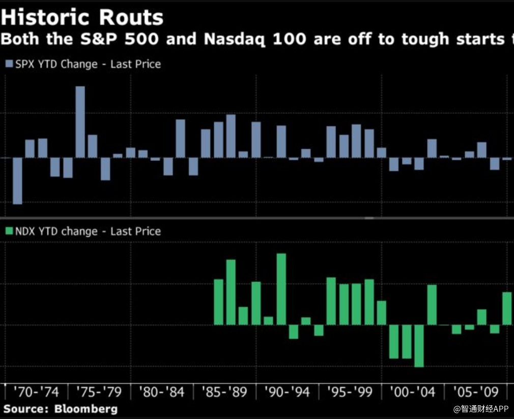 美股今年开局不利。智通财经APP了解到,标普500指数今年以来累计下跌13%,为1970年以来最大跌幅,原因是美联储实施激进的货币紧缩政策以对抗通胀,引发美国经济衰退担忧。不断上升的利率削弱了科技股和成长型股票的吸引力,纳斯达克100指数暴跌22%,创下历史最大跌幅。