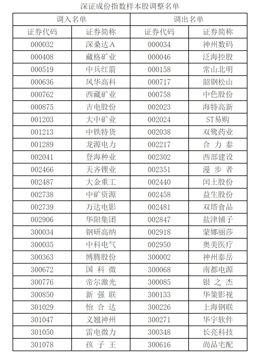 深证成指调入中兵红箭(000519.SZ)、风华高科(000636.SZ)等股。