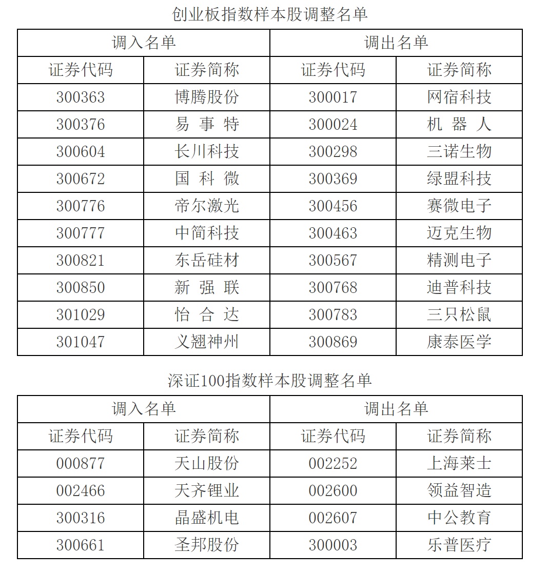 创业板指调入博腾股份(300363.SZ)、易事特(300376.SZ)等股;深证100调入天齐锂业(002466.SZ)、圣邦股份(300661.SZ)等股。