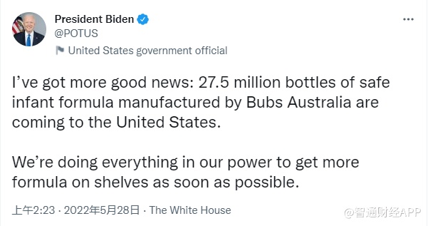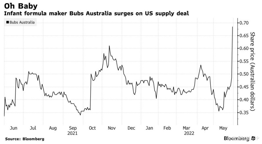 智通财经APP获悉,澳大利亚婴儿配方奶粉制造商Bubs Australia周一在悉尼市场飙升77%,创下五年多来最大涨幅。早些时候,美国总统拜登在推特宣布,Bubs Australia生产的2750万罐安全婴儿配方奶粉即将运往美国。