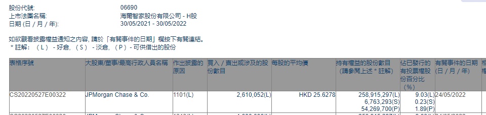 智通财经APP获悉,香港联交所最新资料显示,5月24日,小摩增持海尔智家(06690)261.0052万股,每股作价25.6278港元,总金额约为6688.99万港元。增持后最新持股数目约为2.59亿股,最新持股比例为9.03%。
