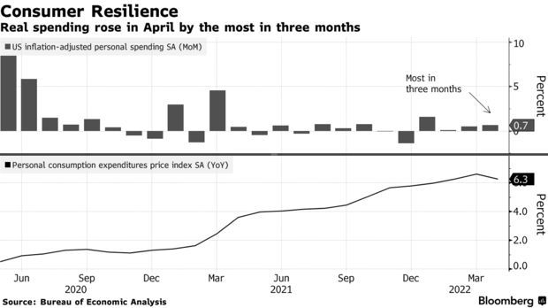 美国商务部上周五公布的数据显示, 作为美联储青睐的通胀指标,美国4月PCE物价指数同比增长6.3%,是美联储目标的三倍多。数据还显示,随着美国家庭动用储蓄,美国消费者支出依然保持坚挺。