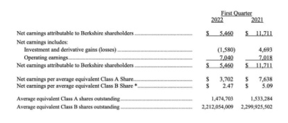金融市场的高波动,自然影响了各大投资企业的业绩表现。巴菲特旗下的伯克希尔哈撒韦公司的2022年第一季度净利润同比下滑53%。主要是投资和衍生品净亏损15.8亿美元,去年同期为净盈利46.9亿美元。当季每股盈利EPS为3702美元,比一年前的7638美元大幅下降,市场预估为4490美元。