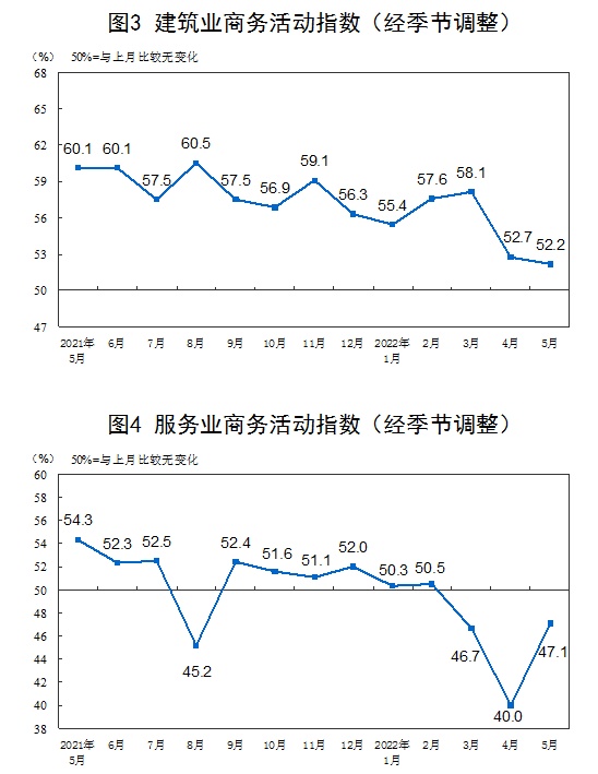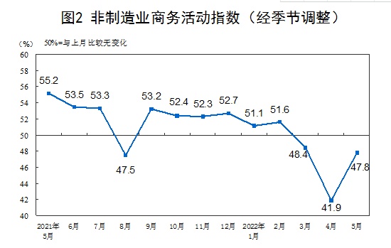 5月份,非制造业商务活动指数为47.8%,比上月上升5.9个百分点,非制造业景气水平明显改善。