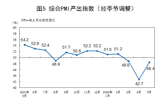 5月份,综合PMI产出指数为48.4%,比上月上升5.7个百分点,表明我国企业生产经营景气水平有所恢复。