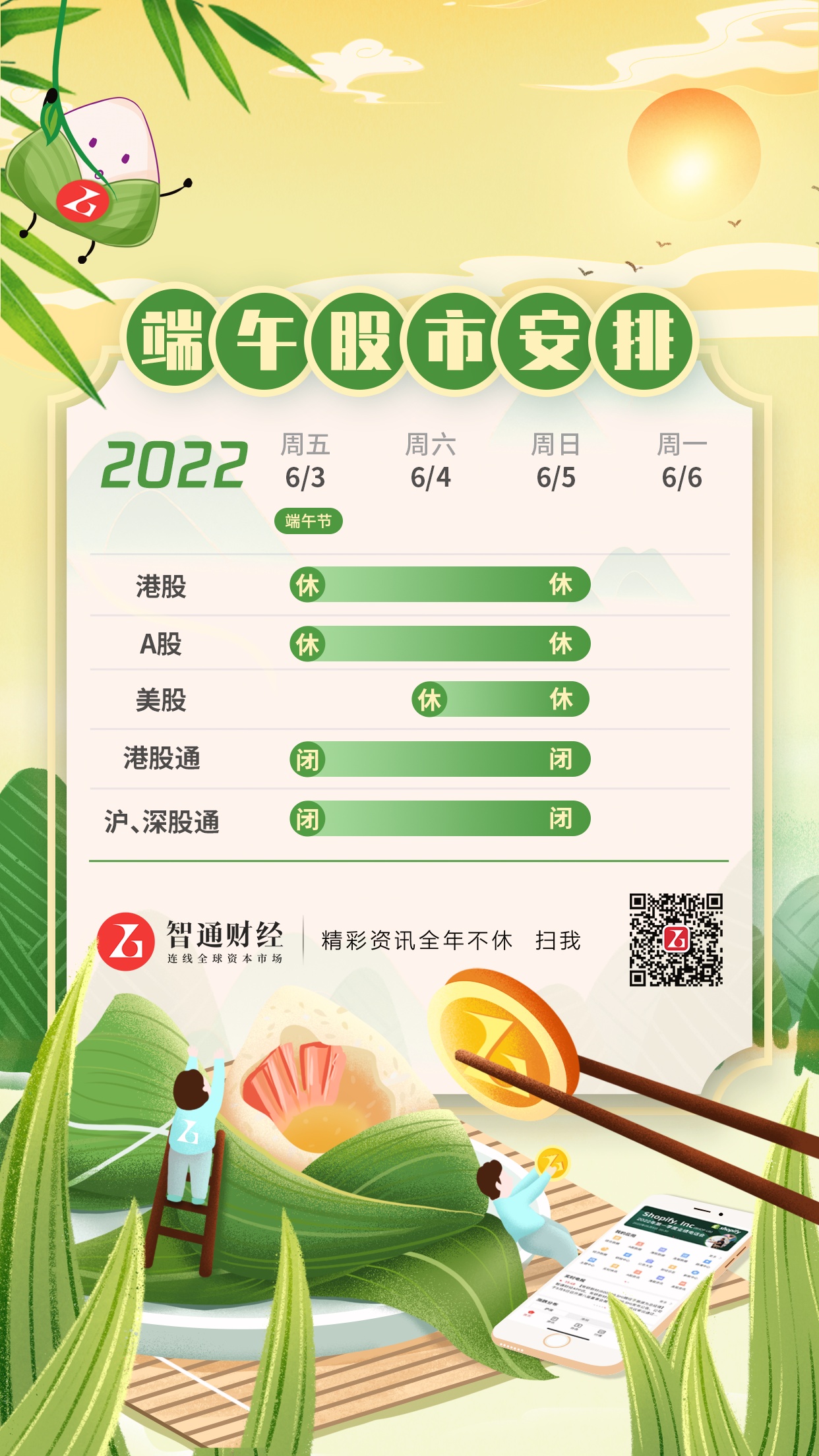 智通财经APP获悉,6月3日(本周五)至6月5日(本周日) 为端午节假期,港股A股休市,6月6日(下周一)恢复正常交易。