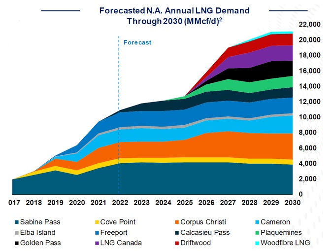 产量方面,市场也预期北美液化天然气年产量将稳步增长,而北美的液化天然气产量增加自然意味着该大陆必须生产和运输更多的天然气,相应地,这对天然气基础设施公司来说将会是个利好消息。