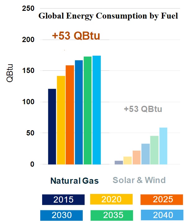 据预测,在2015年至2040年间,全球天然气需求将增长53万亿英热单位。令人惊讶的是,这一增长大致相当于风能和太阳能的预期总增长量。从这就可以明显看出,不仅仅是欧洲,还有像其他能源需求持续增长的亚洲发展中国家等全世界都依赖北美地区的天然气。