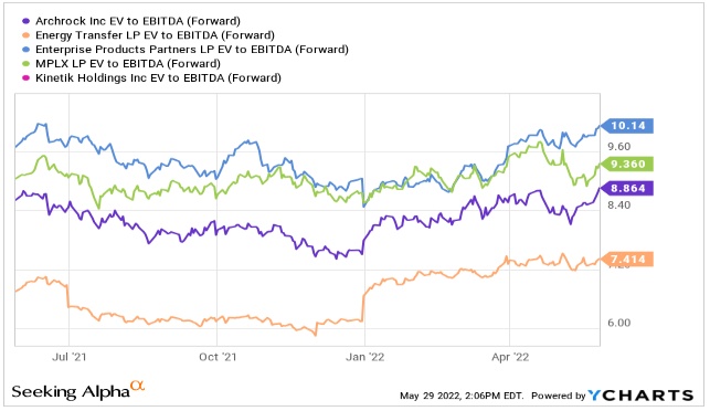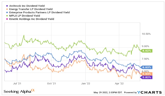 首先,从股息收益率看,在如今一个通胀高企、多数固定收益替代产品实际收益率为负值且没有增长潜力的的世界里,像Archrock(AROC.US)、Energy Transfer(ET.US)、Enterprise Products(EPD.US)、MPLX(MPLX.US)和Kinetik(KNTK.US)股息收益率为6%-9%可以说是极具吸引力的。