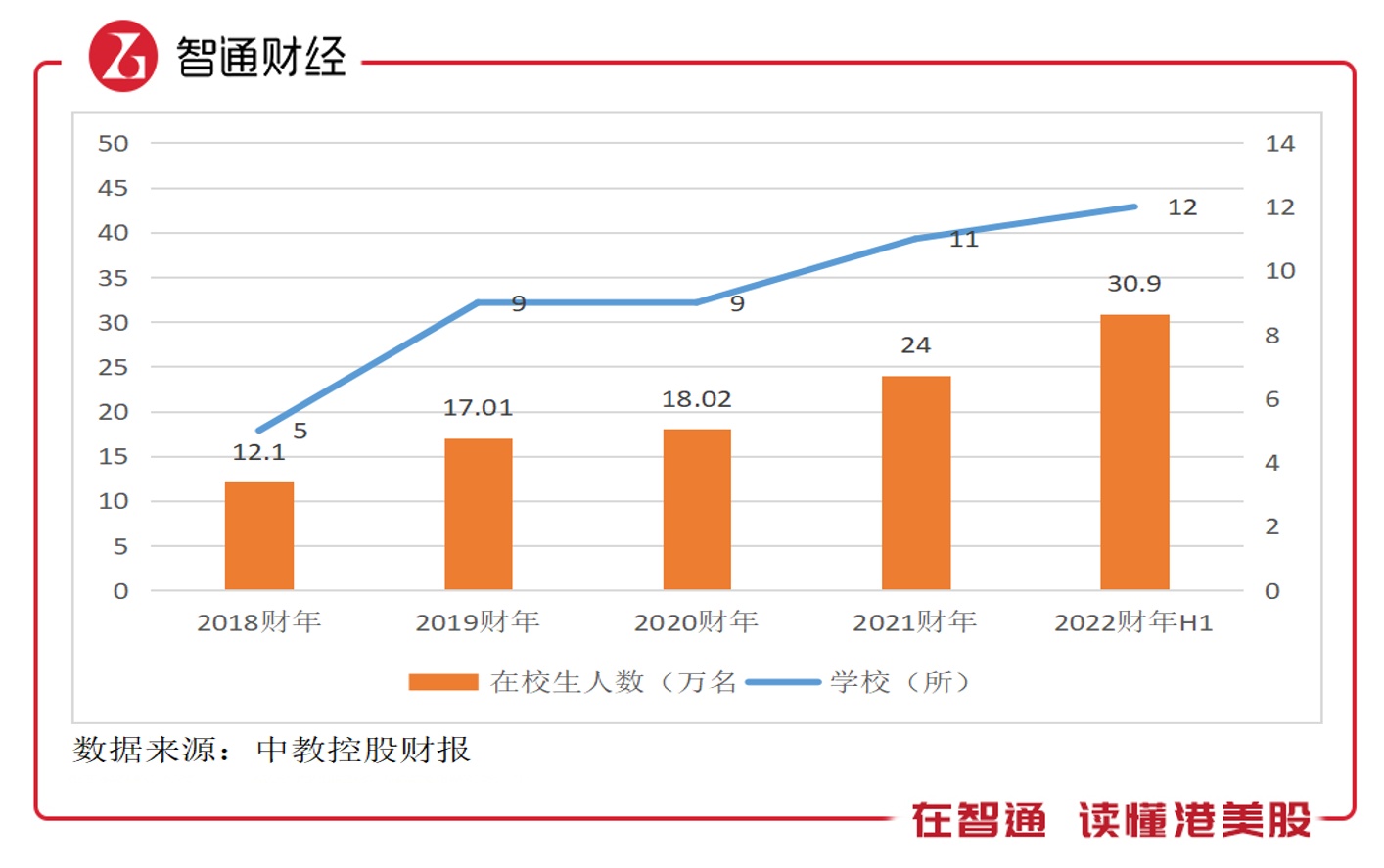 实际上,内生+外延扩张是行业这几年的发展共识,中教控股2017年登陆港股之前,主要在国内运营江西科技学院、广东白云学院及白云技师学院三所学校,上市之后,通过收购不断扩张业务规模,2019年开始收购海外学校,截至2022年2月,该公司在国内拥有12所学校,2所海外学校,在校学生达30.9万名。