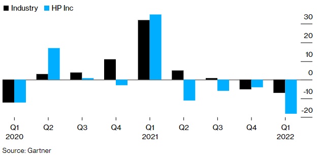 今年前三个月,整个行业的个人电脑发货量下降了6.8%,原因是需求下降、尤其是对学校使用的chromebook的需求下降。分析师Woo Jin Ho指出,惠普在消费者市场的敞口更大,而消费者市场可能更容易受到通胀等宏观经济问题的影响。
