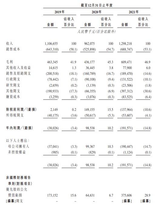 于2019年、2020年、2021年,高视医疗收入分别为约11.067亿元、9.621亿元、12.982亿元人民币;同期,毛利分别为约4.633亿元、4.362亿元6.095亿元人民币。