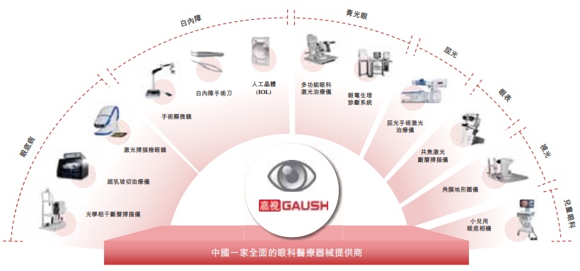 公司的产品组合涵盖全数七个于诊断、治疗或手术会用到眼科医疗器械的眼科亚专科,即眼底病、白内障、青光眼、屈光不正、眼表疾病、视光及儿童眼科,使公司能为客户提供全面及综合解决方案,让客户可透过公司完成采购多种眼科医疗器械产品及服务。公司拥有覆盖不同维度的丰富产品组合,针对白内障、屈光不正、青光眼、眼底病及干眼症等多种眼科疾病。此外,公司产品包括诊断设备、治疗及手术设备以及高值耗材及一般耗材。