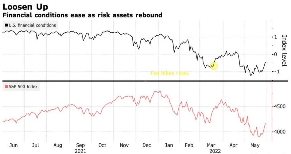 股市自5月中旬低点大幅反弹,信贷利差缩回到3月加息前的水平,而彭博美元现货指数已从本月早些时候触及的两年高点回落。总体而言,彭博衡量美国金融状况的一项指标(衡量市场健康状况的跨资产指标)已恢复到3月份加息前的水平。