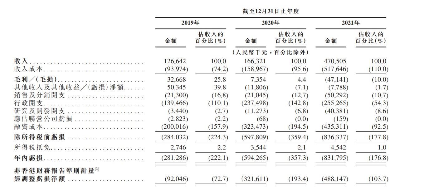 该公司的收入由2019年的人民币1.27亿元大幅增至2021年的人民币4.71亿元。于2019年及2020年,公司分别录得毛利人民币3266.8万元及人民币735.4万元,于2021年,公司产生毛损人民币4714.1万元。于2019年、2020年及2021年,公司分别录得经调整亏损净额人民币9204.6万元、人民币3.22亿元及人民币4.88亿元。