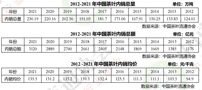 据中国茶叶流通协会报告,2021年,我国茶叶内销总量为230.19万吨,同比增长4.56%;内销总额为3120亿元,同比增速达8.0%;内销均价为135.5元干克,同比増3.3%。2012-2021九年间,中国茶叶内销总额实现复合年增长率达11.45%,增长强劲。