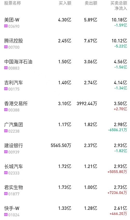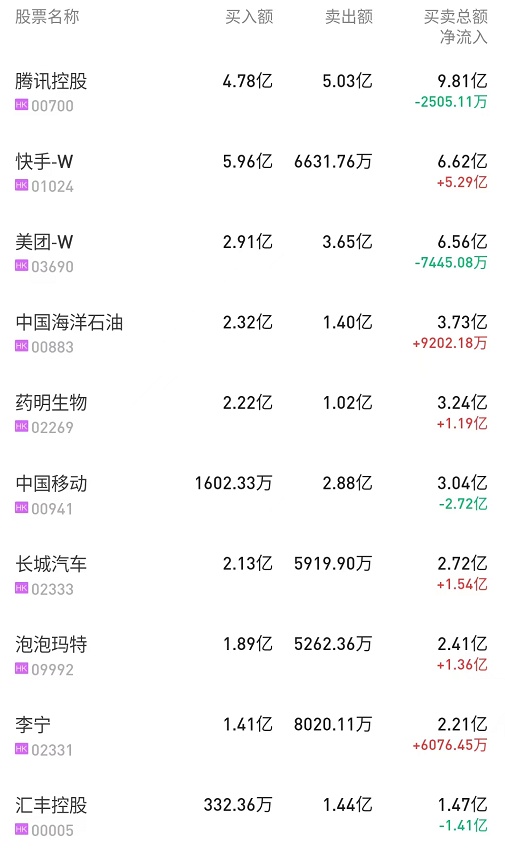 此外,药明生物(02269)、李宁(02331)分别获净买入1.19亿、6076万港元。而中国移动(00941)、建设银行(00939)、汇丰控股(00005)分别遭净卖出2.72亿、1.81亿、1.4亿港元。