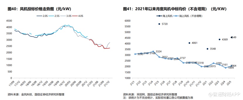 根据国信证券统计,2022年5月陆上风电机组(不含塔筒)平均中标价格为2064元/千瓦,环比上升8.98%,海上风电机组平均中标价格为4549元/千瓦。不过随着全球经济复苏各国补库存完成后,大宗商品或将下行,风机价格有望再次回到下降通道。