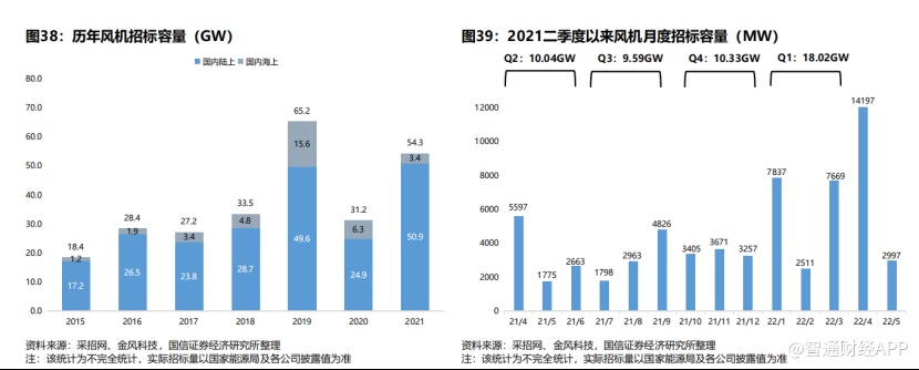 受益于风机价格下降带来的风电平价,自2020年陆上风电平价以来,风电招标量和装机量稳步提升。根据国家统计局数据,截至2022年4月底,全国风电装机容量338.26GW,同比增长17.7%,其中陆风311.61GW,海风26.65GW。根据国信证券不完全统计,2022年初至今风机招标总容量约35.21GW,其中陆风31.50GW,海风3.71GW,5月风机招标量3.00GW,其中陆风2.04GW,海风0.95GW。