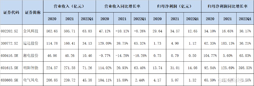 先看业绩方面,2021年金风科技实现营业收入505.71亿元,同比下降10.12%;归母净利润34.57亿元,同比增长16.65%。而竞争对手明阳智能和运达股份在2021年营收分别为271.58亿元和160.41亿元,同比增长分别为20.93%和39.75%;归母净利润方面明阳智能和运达股份分别实现31.01亿元和4.9亿元,同比增长分别为125.69%以及183.13%。同样的,在今年Q1金风科技的表现也不如明阳以及运达股份。