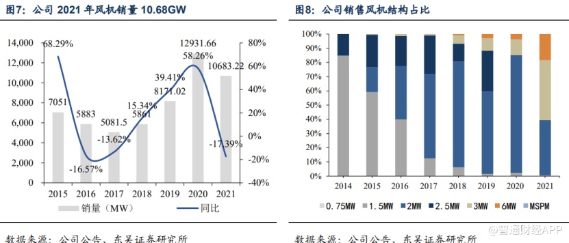 截至2021年底,金风科技在手外部订单合计16.9GW,较2020年底增加17.36%。其中,已签合同待执行订单共计13.27GW,分别为1.5MW机组25.50MW,2S平台产品2.85GW,3S/4S平台产品7.86GW,MSPM机组2.54GW;外部中标未签订单为3.60GW,包括2S平台产品0.35GW,3S/4S平台产品0.97GW,MSPM机组2.28GW。截止2021年底,MSPM在手外部订单合计4.82GW,未来将成为公司风机业务新的增长点。