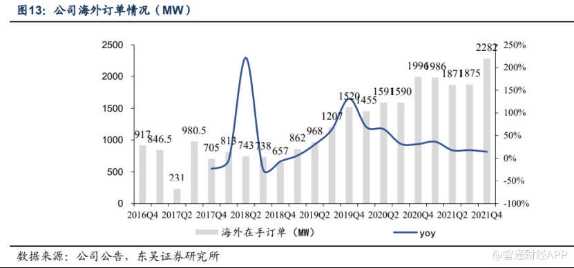海外业务方面,2021年除了在澳洲、欧洲等重点市场取得多项突破,金风科技同时积极布局非洲、亚洲等新兴市场,国际业务已遍布全球六大洲,实现海外销售收入60.6 亿元,同比增长31.90%,截至2021年底,公司的海外在手订单量2.28GW,同比增长14.31%。