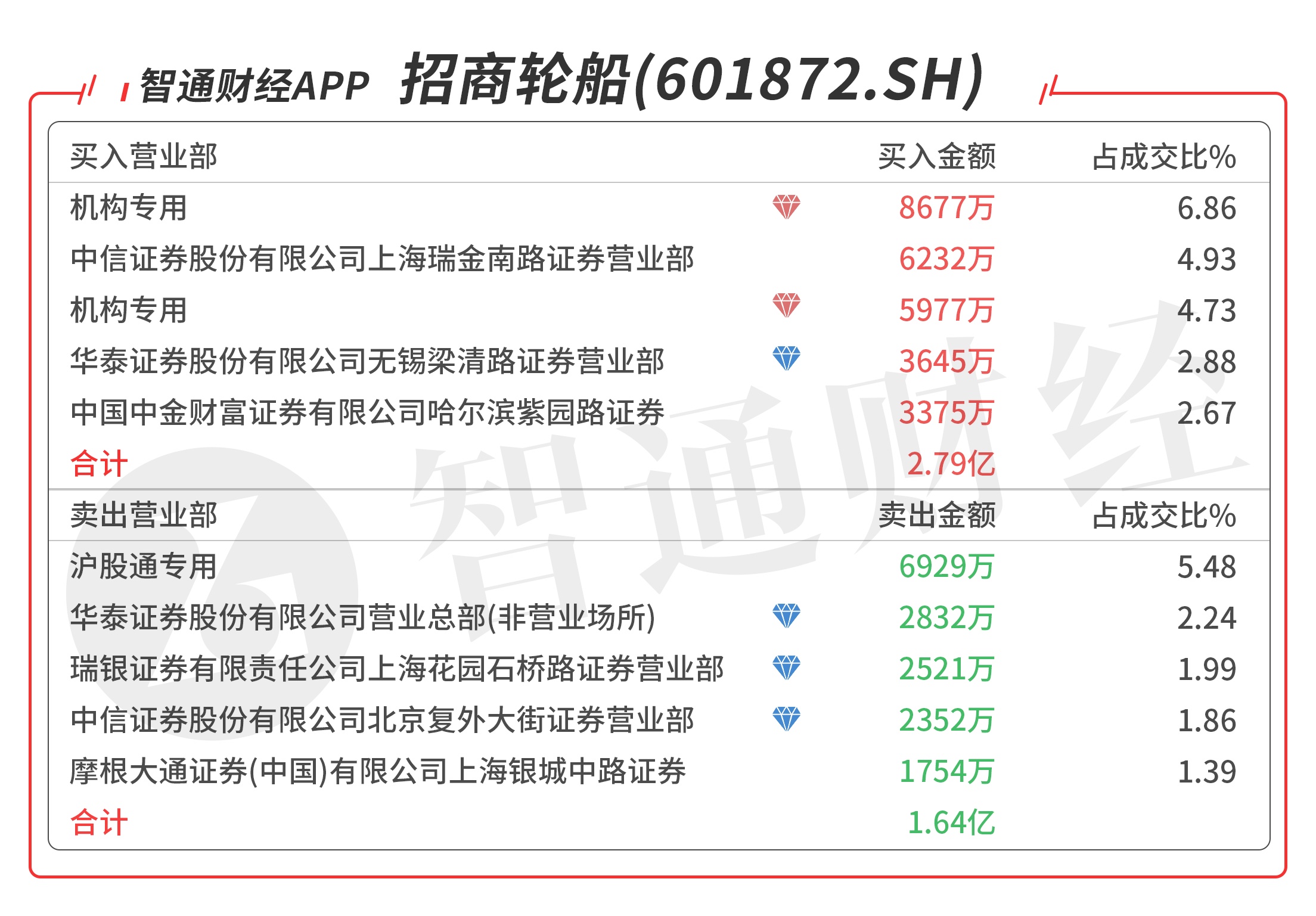 招商轮船(601872.SH):龙虎榜阵容豪华,2家机构席位合计净买入1.47亿元,沪股通卖出6930万元,买二是知名游资古北路的席位买入6232万元,买四是知名游资的席位买入3645万元,当日净买入1.15亿元,该股今日股价创近期新高,走趋势以低吸为主。