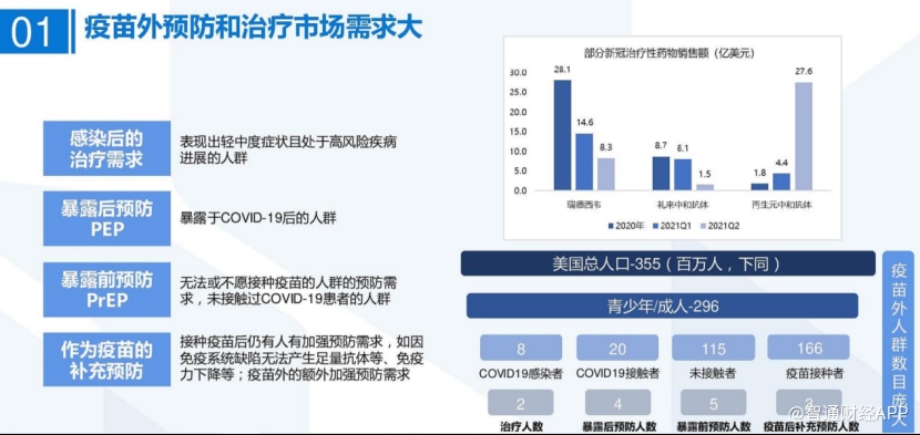 原因在于,相较于新冠感染人群,当前以密接预防为主的疫苗外预防和治疗市场的未满足治疗需求更大。据国泰君安证券预测数据,以美国为例,确诊患者与密接者的数量比例达到1:2.5,预计需要密接预防治疗的人群达到2000万,远高于感染人群。