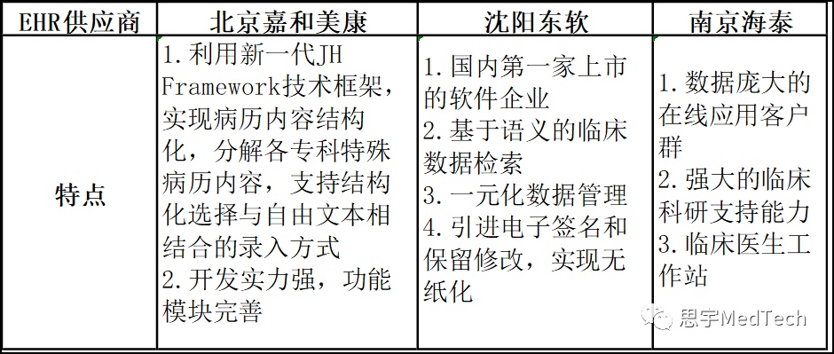 目前市场上主要的EHR供应商有北京嘉和美康(688246.SH)、沈阳东软和南京海泰。