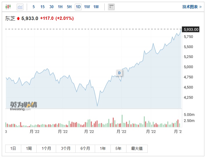 受此消息影响,截至发稿,东芝日股涨逾2%,报5933.0日元。