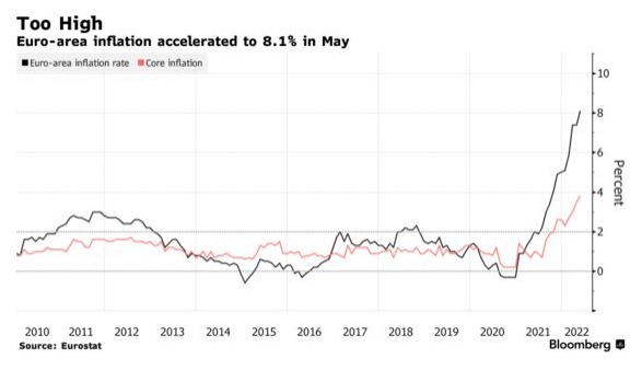 欧元区5月份消费者价格同比上涨8.1%,超过了市场预期中值7.8%,通胀水平再创历史新高。