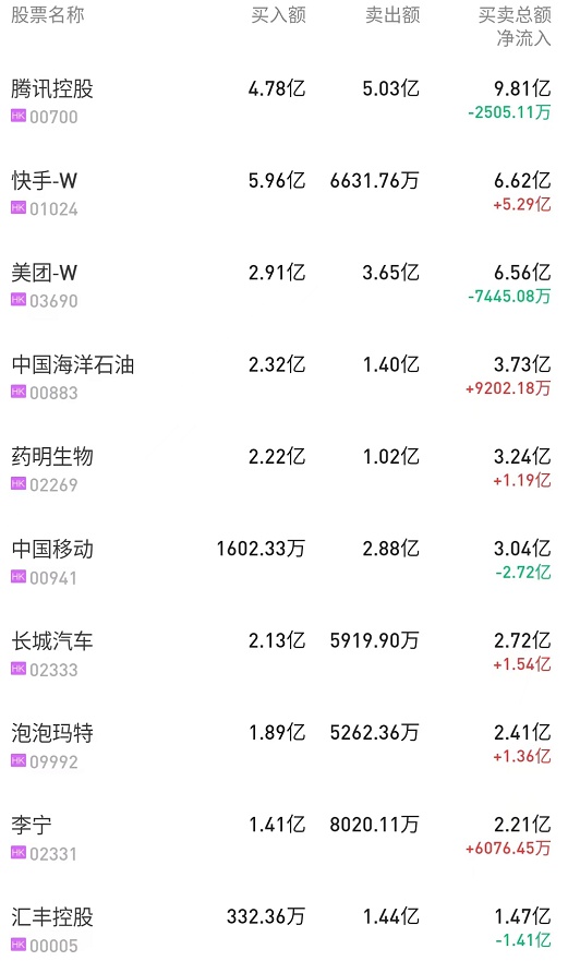 北水净买入最多的个股是快手-W(01024)、长城汽车(02333)、海螺水泥(00914)。北水净卖出最多的个股是腾讯(00700)、建设银行(00939)、中海油(00883)。