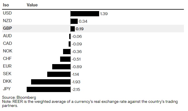 实际有效汇率(REER)也显示,英镑被高估了。加拿大皇家银行资本市场(RBC Capital Markets)首席外汇策略师Adam Cole最近强调了这一担忧。在他团队追踪的23种货币中,他们对英镑的表现最悲观。