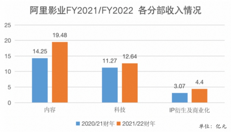 拆分收入结构来看,阿里影业的收入来源于内容、科技和IP衍生及商业化三大板块。就业务范围而言,内容板块指国内外影视娱乐内容如电影、剧集等的投资及制作。2021/22财年,该板块实现19.48亿元,占总营收比重为53.3%,同比增幅达到36.7%。