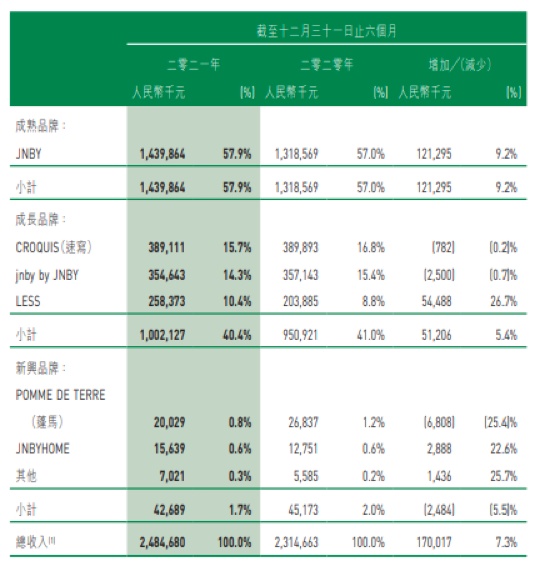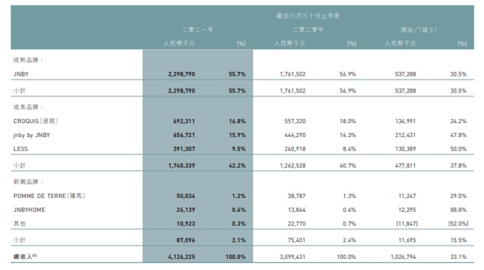 速写、jnby by JNBY、LESS则为公司定位的成长品牌。其中,备受争议的jnby by JNBY是江南布衣旗下主打童装市场的品牌,该品牌为公司第三大收入的品牌。2021财年jnby by JNBY的营收达到6.57亿元,占公司总营收的14.3%,同比大涨47.8%。这一增幅,甚至超过江南布衣核心品牌JNBY同期30.5%的营收同比增幅。
