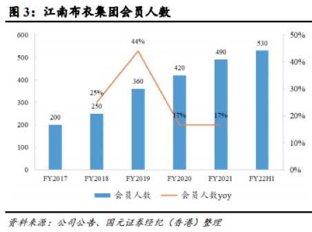 与此同时,江南布衣的粉丝数量增长也面临瓶颈。2017财年至2020财年,江南布衣会员会员账户数(去重,下同)分别为200万个、250万个、360万个和420万个,年均复合增速接近30%。2020财年,会员数量同比增长16.67%,远低于2019财年同期44%的增速。2021财年,公司会员数量达到490万个增幅维持在16.67%。截至2021年12月31日,公司会员数量达到530万个,较2021财年增长8.16%。
