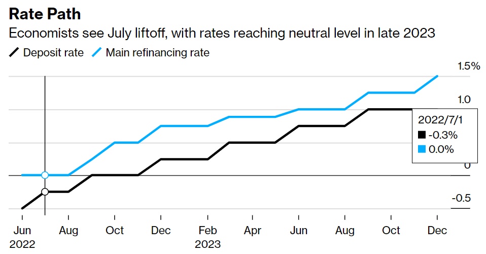 彭博调查显示,欧洲央行将在7月份将存款利率(目前为-0.5%)提高25个基点,并在9月份再次加息25个基点;这与欧洲央行行长拉加德在第三季度结束低于零的借贷成本的承诺相一致,但与奥地利央行行长霍尔兹曼等官员所寻求的路径相比,这一举措没有那么激进。