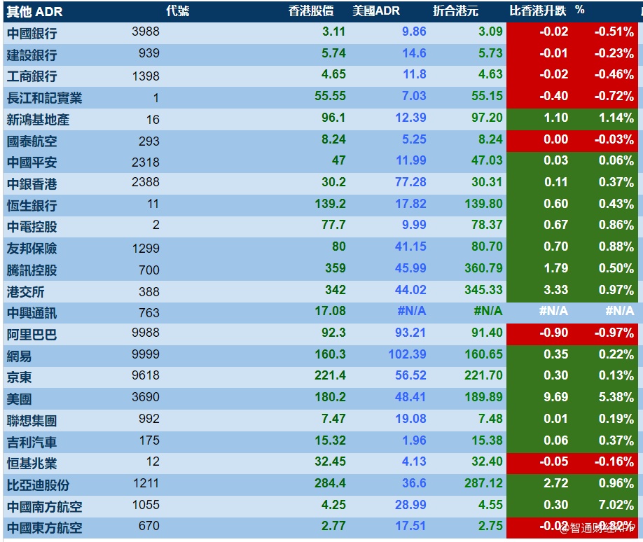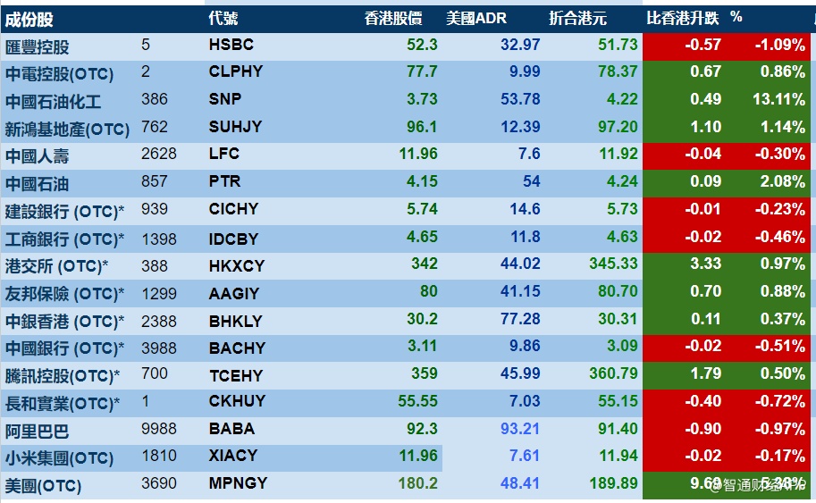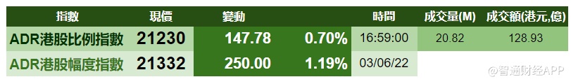 智通财经APP获悉,周五美股三大指数集体下跌,港股ADR指数逆势上涨,按比例计算,收报21230点,较香港收市涨147.78点或0.70%。